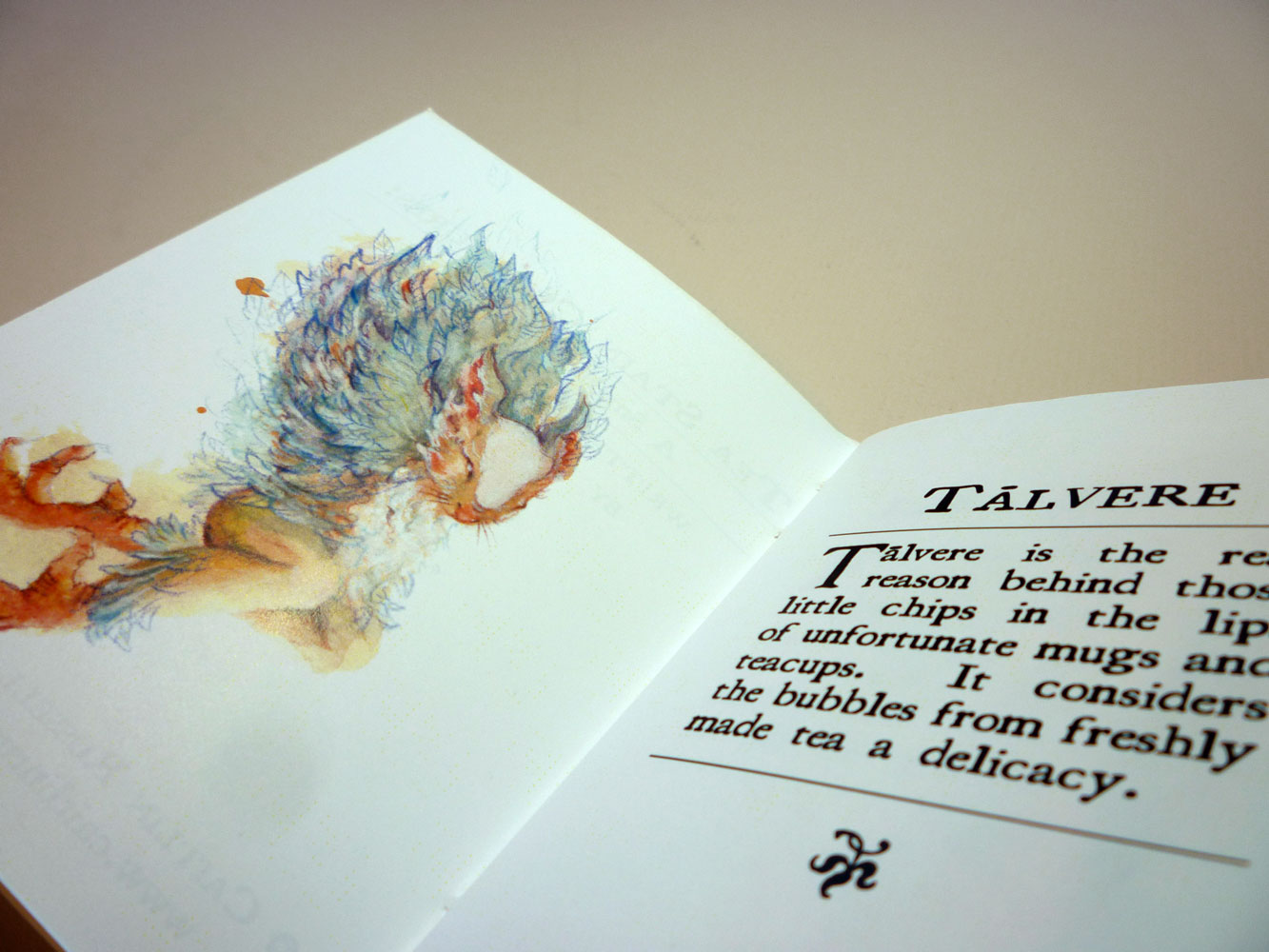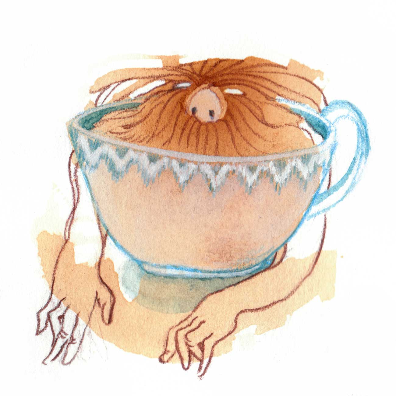 A collection of imaginary beings created out of tea stains. Most of these were painted after my morning tea (and a few with midnight tea). I’d take the steeped tea bag, randomly dab it onto watercolour paper, let it dry and expand on what I saw with watercolour and pencil crayon. Aside from a bit of filling in, each creature keeps true to the shape of the original stain.